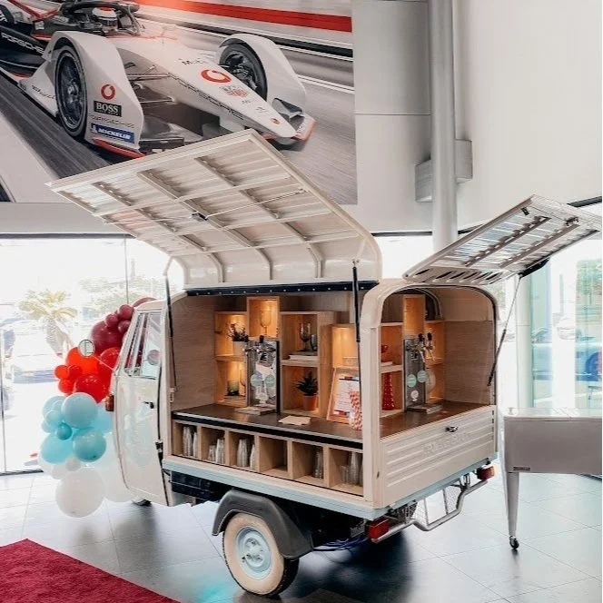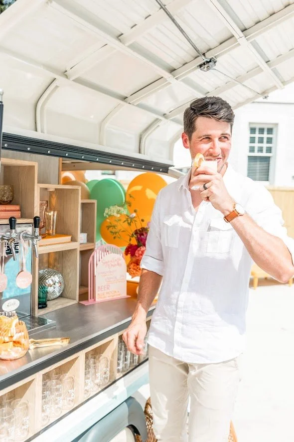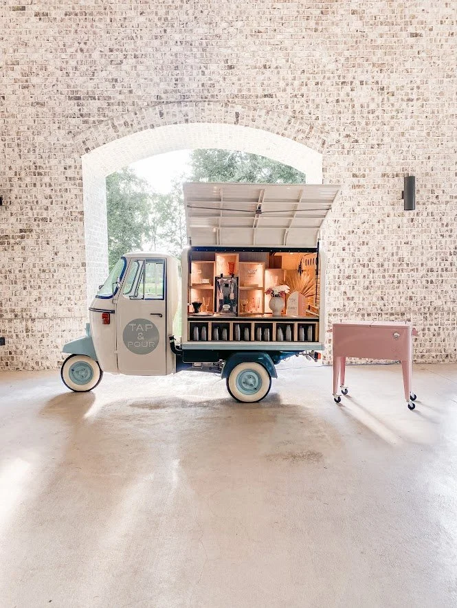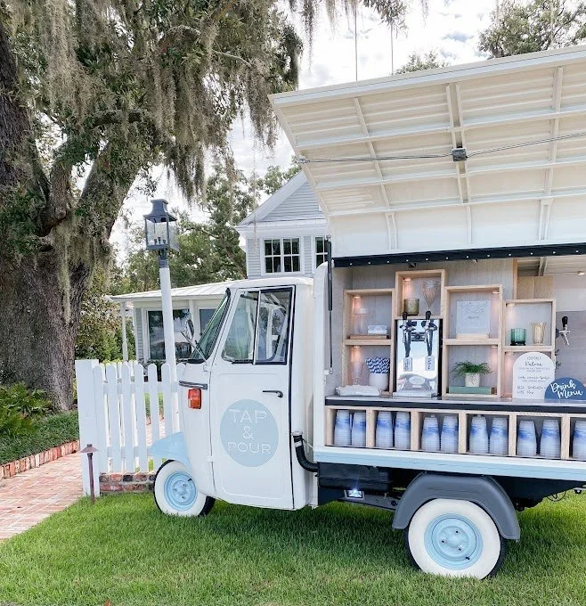 Every package includes: Set-up and break-down of mobile bars, 2-4 taps for service, clear plastic cups, white beverage napkin, retro cooler for ice, personalized beverage planning + alcohol ordering guide, custom professional printed drink menu, bar top decor to match theme/colors.