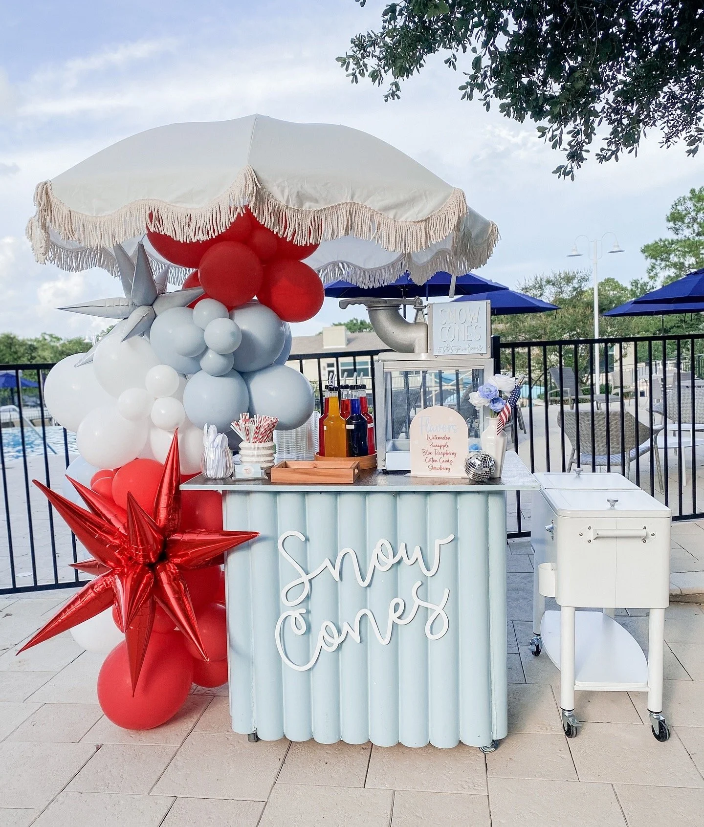 Package includes: 5 flavors, attendant, choice of umbrella and cooler color, ice, cups, straws, spoons and custom menu. A $60 fee will be added for guest count over 50.